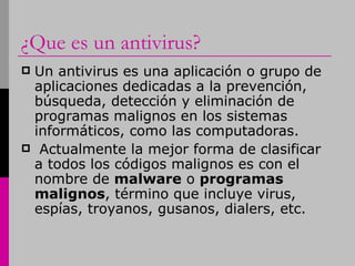 Un antivirus es una aplicación que previene, detecta y elimina malware como virus, troyanos y gusanos. Algunos ejemplos de antivirus populares son Panda Security, Norton Antivirus y McAfee. Los virus pueden causar problemas como pérdida de productividad y rendimiento reducido. Otras herramientas de seguridad incluyen cortafuegos, que bloquean el acceso no deseado a una red; antiespías, que eliminan spyware; antipop-ups, que bloquean ventanas emergentes; y antispam, que