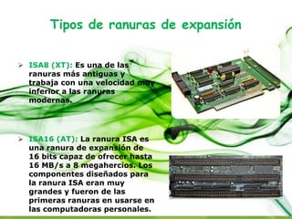 Una ranura de expansión es un elemento de la placa base que permite conectar tarjetas adicionales para expandir las funciones del computador, como controlar más dispositivos periféricos. Algunos tipos de ranuras de expansión incluyen ISA, EISA, VESA, PCI, AGP y PCIe, las cuales varían en ancho de banda, velocidad y compatibilidad con dispositivos. Las ranuras más modernas como PCIe ofrecen mayores velocidades de transferencia.
