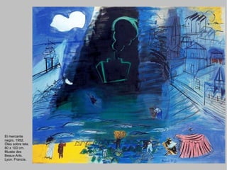 Este documento presenta una lista de obras del pintor francés Raoul Dufy, incluyendo óleos, acuarelas y dibujos. Las obras se exhiben en varios museos de Francia, Canadá, Inglaterra y Estados Unidos, y representan diversos temas como retratos, paisajes, bodegones y escenas taurinas. Dufy fue un destacado artista fauvista y diseñador textil francés activo entre finales del siglo XIX y mediados del siglo XX.