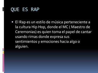 El documento describe el rap y su historia. El rap surgió en los barrios negros y latinos de Nueva York en la década de 1970 como expresión de la cultura hip hop. Musicalmente, el rap se diferencia del hip hop en que rompe con las influencias del funk y el disco, acercándose más al breakdance. Originalmente, los raperos rapeaban sobre las músicas de un DJ, pero con el tiempo el rap evolucionó hacia letras más metafóricas y complejas.