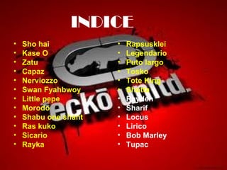 Este documento proporciona una lista de artistas de rap y reggae junto con breves descripciones de cada uno. Incluye nombres como Kase O, Zatu, Capaz, Nerviozzo, Swan Fyahbwoy, Little Pepe, Morodo, Shabu one shant, Ras kuko, Sicario, Rayka y legendas como Bob Marley y Tupac Shakur.