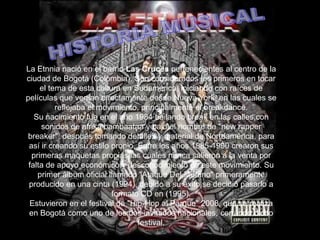 La Etnnia se formó en 1984 en Bogotá, Colombia y fueron los primeros en introducir el breakdance y hip hop a Sudamérica, inspirándose en películas de Nueva York. Aunque tuvieron dificultades para publicar su música en los años 80 y 90 debido a falta de apoyo, lanzaron su primer álbum "Ataque del Metano" en 1995. Desde entonces han ganado varios premios reconociendo su contribución al hip hop colombiano y su mensaje social.