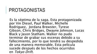 Rápidos y Furiosos 7 es la séptima película de la exitosa franquicia de acción, dirigida por James Wan. Protagonizada por Vin Diesel, Paul Walker y otros actores regulares de la saga, la película continúa la historia después de los eventos de Tokyo Drift, aunque el rodaje se vio afectado por el fallecimiento de Walker y tuvo que ser reanudado meses después para darle un cierre a su personaje.