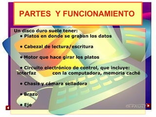 Un disco duro almacena información digitalmente usando grabación magnética. Consiste en platos giratorios, cabezales de lectura/escritura, un motor, circuitos electrónicos y una carcasa sellada. Los datos se escriben y leen en los platos usando los cabezales mientras giran. Los discos duros varían en tamaño, capacidad, velocidad y interfaz de conexión. El primer disco duro pesaba una tonelada y tenía solo 5 MB, mientras que ahora existen discos de hasta 15 TB.