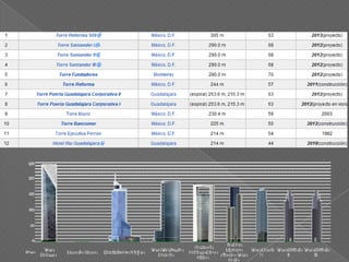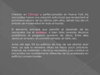 Los rascacielos se originaron en Chicago y Nueva York y revolucionaron el paisaje urbano en los últimos 100 años. El ascensor fue clave para su desarrollo, al igual que otros avances como el acero y el concreto armado. El primer edificio considerado un rascacielos fue el Home Insurance Building de 10 plantas en 1884, aunque el primero moderno fue el Park Row Building de Nueva York de 30 plantas en 1899. Los rascacielos permiten obtener gran cantidad de espacio en poco terreno, compensando los altos costos de construcción.