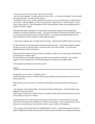 Este documento narra la historia de Natalia, una chica de 17 años cuya relación de un año con su novio Luis termina abruptamente. Natalia queda devastada y aislada, ya que Luis y sus amigos eran un grupo muy unido. Dos meses después, cuando Natalia comienza a recuperarse, Luis empieza a salir con su amiga Carla. Un día en la escuela, Natalia se encuentra sola en el baño de hombres donde conoce a Mateo, un chico misterioso que la ayuda a esconderse de Luis.