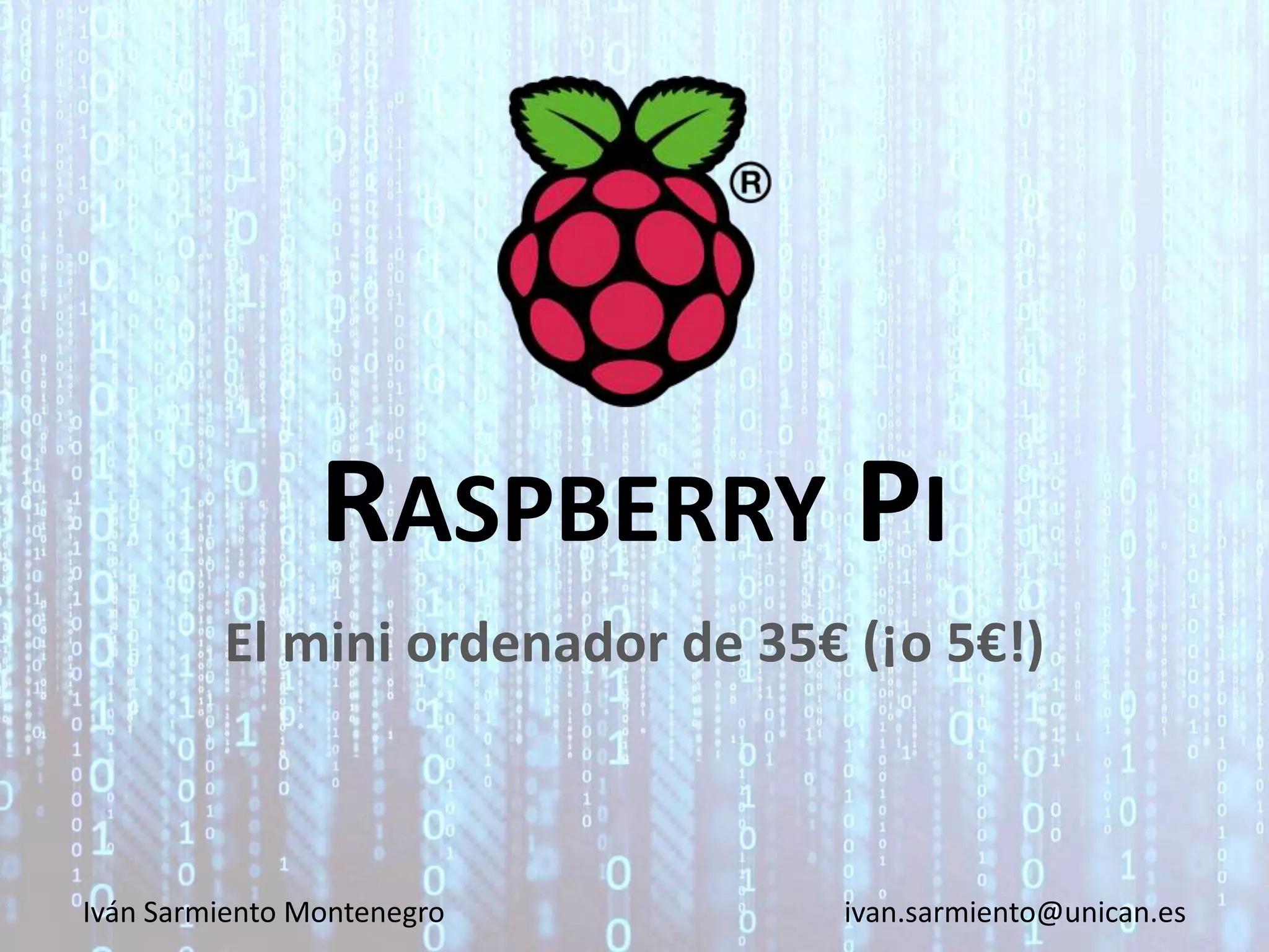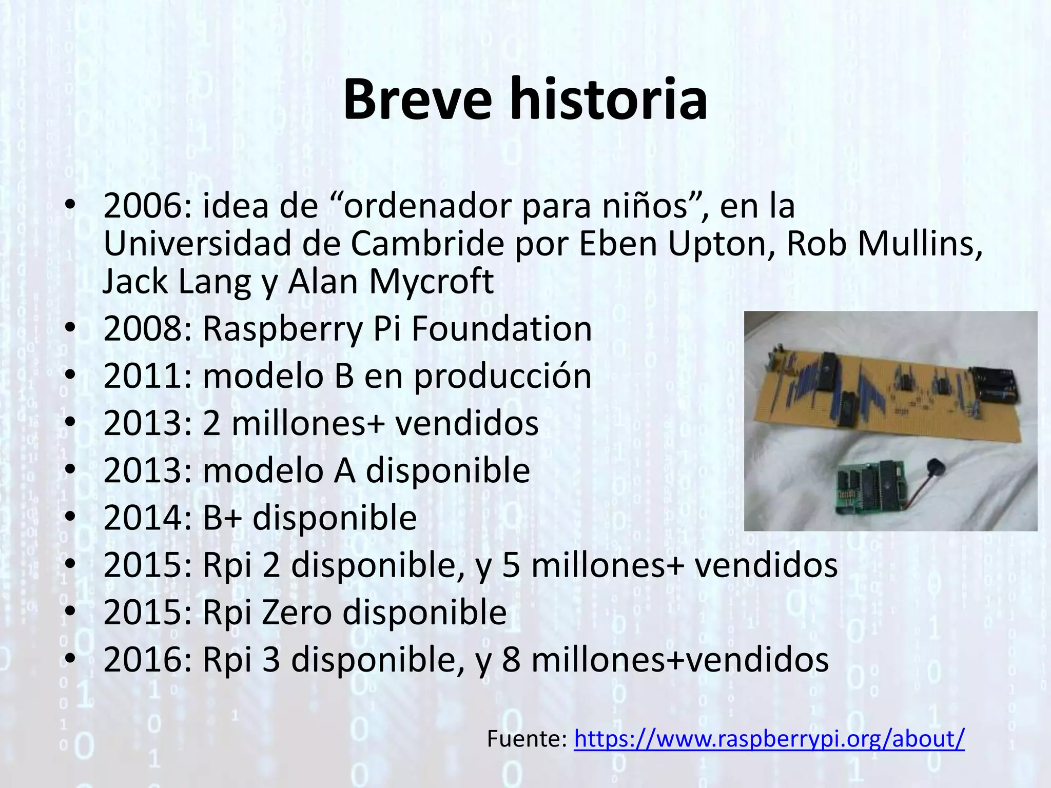Este documento proporciona una introducción al Raspberry Pi, incluyendo su historia desde 2006, modelos disponibles como el Modelo B, Modelo A, Modelo B+, Modelo 2 y Modelo 3. Explica sus características técnicas, conexiones y requisitos básicos. También resume aplicaciones populares como PC de sobremesa, tablet, mediacenter, retrogaming, servidor web, descargas, punto de acceso WiFi y video vigilancia. Finalmente, menciona otros proyectos como domótica, sistemas de riego, escaneo 3
