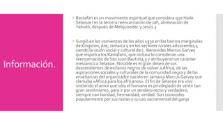 Rastafari es un movimiento espiritual que surgió en Jamaica en los años 1930 y considera a Haile Selassie I, el último emperador de Etiopía, como la tercera reencarnación de Dios después de Melquisedec y Jesús. Los rastafaris se inspiraron en las enseñanzas de Marcus Garvey sobre el regreso de los negros a África. Siguen una filosofía de paz, amor y hermandad y son conocidos por sus rastas y el uso del cannabis.