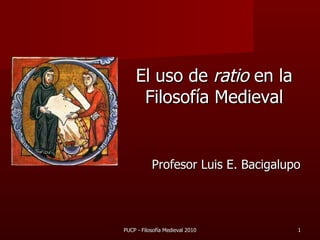 El documento describe el uso del término "ratio" en la filosofía medieval. Ratio se refiere a la facultad discursiva humana de entender conceptos universales, distinta del intelecto que comprende intuitivamente. En la filosofía medieval, ratio tenía tres sentidos como capacidad de aprehensión de la realidad, diferencia específica humana, y facultad de conocimiento discursivo. Existió debate sobre si ratio se refería a la razón práctica o al entendimiento teórico.