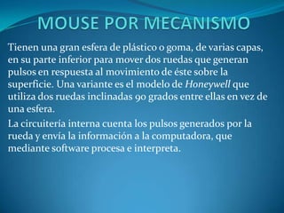 El documento describe diferentes tipos de dispositivos apuntadores utilizados para facilitar el manejo de un entorno gráfico en una computadora, incluyendo mouses tradicionales con esferas de plástico o goma que generan pulsos al moverse, variantes sin esferas, y mouses ópticos más sensibles y precisos que usan tecnología láser.