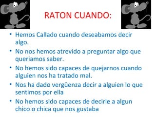 El documento describe tres tipos de comportamientos: la persona rata, la persona monstruo y la persona auténtica. La persona rata es tímida y le cuesta hacer amigos. La persona monstruo se comporta de forma agresiva y busca siempre tener la razón. La persona auténtica es sincera, justa y respeta a los demás sin aprovecharse de ellos.