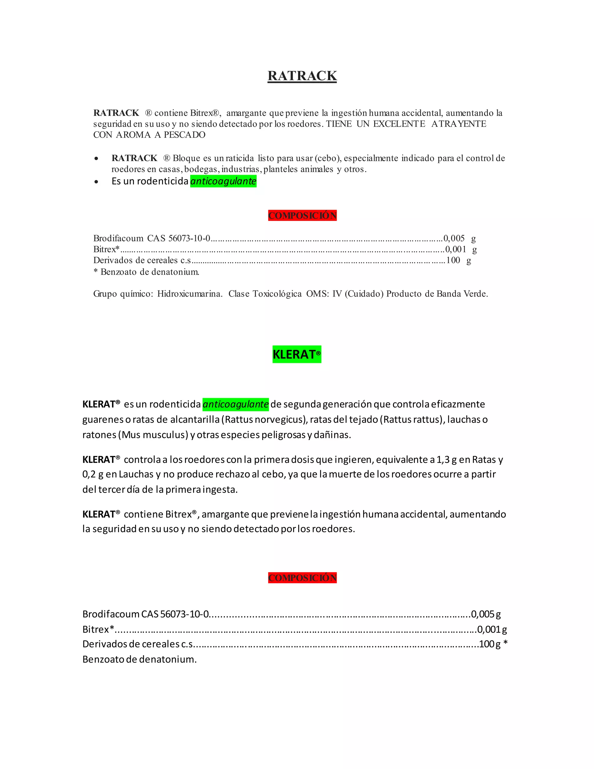 Ratrack y Klerat son raticidas anticoagulantes que contienen brodifacoum y bitrex para prevenir la ingestión humana accidental. Ambos productos son cebos listos para usar que atraen y controlan eficazmente roedores como ratas y ratones con solo una dosis, causando la muerte a partir del tercer día sin rechazo del cebo. Los raticidas son de banda verde y se recomiendan para el control de plagas en casas, granjas y otras instalaciones.
