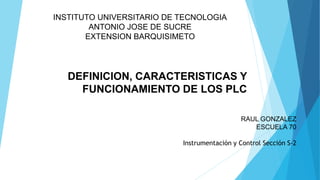 Este documento define y describe las características y el funcionamiento de los controladores lógicos programables (PLC). Explica que los PLC son dispositivos electrónicos utilizados para programar y controlar procesos secuenciales en tiempo real en la automatización industrial. Describe que los PLC controlan la lógica de funcionamiento de máquinas y plantas industriales mediante el procesamiento de señales digitales y analógicas y la aplicación de estrategias de control. Resalta que los PLC son controlables, lógicos y programables, y que