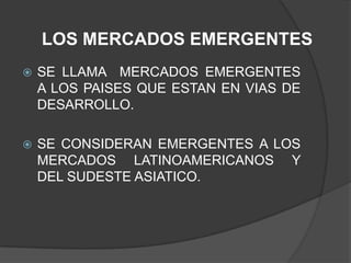 Este documento resume los mercados emergentes y las empresas multinacionales que han surgido de ellos. Define los mercados emergentes como aquellos en países en desarrollo, particularmente en América Latina y el sudeste asiático. Identifica varias empresas multinacionales de talla mundial que se originaron en países emergentes como Corea del Sur, Taiwán, China, India, Brasil y México. Explica el concepto de "BRIC" para referirse conjuntamente a Brasil, Rusia, India y China, y predice que estas cuatro economías pod