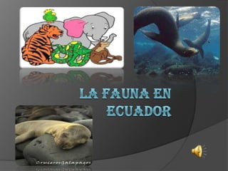 Este documento describe la diversa fauna del Ecuador, incluyendo más de 3,800 especies de vertebrados, 1,550 especies de aves y 350 especies de reptiles. La fauna varía según la región, con una gran riqueza en la selva amazónica que alberga especies como caimanes, peces grandes y variedades de aves. El documento también discute conceptos como fauna silvestre, doméstica y en proceso de domesticación, e identifica varias especies amenazadas de extinción en el Ecuador.