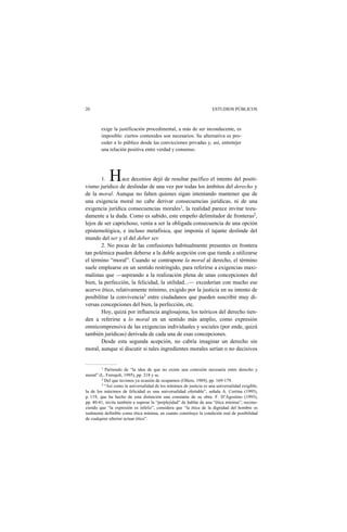 El documento analiza la relación entre derecho y moral desde la perspectiva de lo público y lo privado. El autor critica la noción de Rawls de que la ética pública debe ser meramente procedimental y sin contenidos, argumentando que ciertos contenidos son necesarios para lo público. Propone que la ética pública debe construirse a partir de las convicciones privadas de los ciudadanos, entretejiendo una relación positiva entre verdad y consenso.
