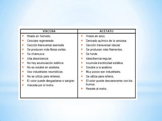 El documento proporciona información sobre las fibras textiles y el rayón. Explica que una fibra es un filamento delgado y flexible cuya longitud es mucho mayor que su diámetro, y que las fibras se utilizan para hacer hilos y telas. Luego describe las propiedades de las fibras y cómo afectan las características de las telas. Finalmente, detalla el proceso de fabricación del rayón, incluida la obtención de la celulosa, su conversión química en una solución viscosa y la extrusión de filamentos a través