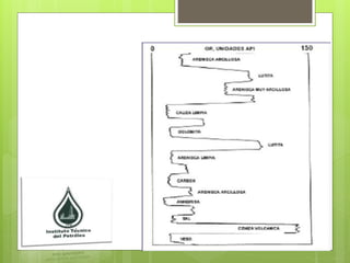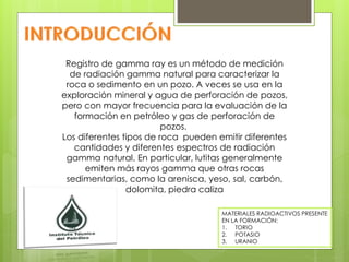 El registro de gamma ray mide la radiación gamma natural para caracterizar la roca en un pozo, usándose comúnmente para la evaluación de formaciones de petróleo y gas. Diferentes tipos de roca emiten diferentes cantidades y espectros de radiación gamma, con lutitas emitiendo más que areniscas. El equipo incluye un contador y un cartucho electrónico que suministra voltaje al contador para formar y amplificar las pulsaciones transmitidas a la superficie como un registro continuo.