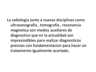 Este documento proporciona una breve historia y descripción de la radiología e imagenología. Explica que la radiología y disciplinas como la ultrasonografía, tomografía y resonancia magnética son herramientas de diagnóstico importantes. También resume brevemente la historia del desarrollo de la radiología desde los rayos X de Roentgen en 1895 hasta el desarrollo de la tomografía computarizada y la resonancia magnética en las últimas décadas. Además, describe los principios básicos de la formación de imágenes