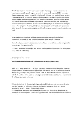 Este documento describe los rayos y truenos, incluyendo su formación, frecuencia, temperatura y poder destructivo. También ofrece consejos sobre seguridad durante tormentas, como alejarse de objetos metálicos, árboles altos y lugares elevados, y buscar refugio dentro de un vehículo si es posible. Además, explica que los pararrayos son una buena protección, pero no infalible, y que los rayos pueden caer más de una vez en el mismo lugar.