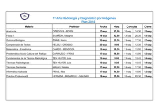 El documento presenta los planes de estudio para los tres años de la carrera de Radiología y Diagnóstico por Imágenes, incluyendo las materias, profesores, fechas, horarios de consulta y cierre de inscripciones. Se detallan 11 materias para el primer año, 12 materias para el segundo año y 10 materias para el tercer año, con información sobre los profesores a cargo de cada una.