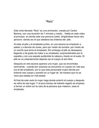 Este cortometraje animado de 7 minutos y medio titulado "Raíz" describe cómo un jefe mata a su empleado de un golpe de espada por la espalda durante una pelea. Más tarde, una mujer encuentra el cuerpo y lo entierra, pero un árbol crece en el lugar con el rostro de la víctima.
