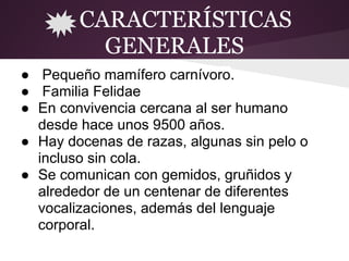 Este documento describe las características generales de los gatos y presenta información sobre cuatro razas específicas: Bombay, Abisinio, Angora Turco y Azul Ruso. Describe sus orígenes, características físicas y de personalidad.