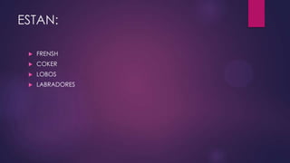 Este documento enumera varias razas de perros comunes como French, Coker, lobos y Labradores. Describe a estos perros como tiernos, inteligentes y muy obedientes, aptos para vivir en cualquier ambiente debido a su naturaleza cariñosa y obediente.