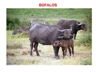 El documento proporciona información sobre las características, orígenes y usos del búfalo. Describe varias especies de búfalos como el asiático, el de agua, el cafre y el bisonte norteamericano. También resume las principales razas de búfalos como el Murrah, Mediterráneo, Carabao y Jafarabadi. Explica que los búfalos se crían principalmente para la producción de leche, carne y como fuerza de trabajo.
