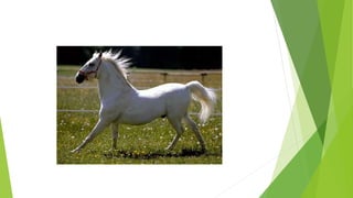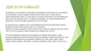 Este documento describe las características de varias razas de caballos, incluyendo el caballo árabe, cuarto de milla, mustang, clydesdale, frisón, percherón, miniatura, shetland, morgan, pura sangre, andaluz, shire, paint horse, silla manchada, islandés, marwari, y camargue. Cada raza se distingue por su tamaño, color, lugar de origen y propósito histórico como caballos de tiro, carreras, monta o trabajo agrícol