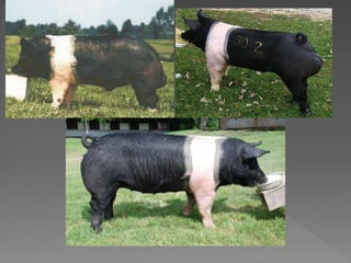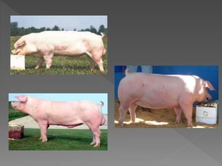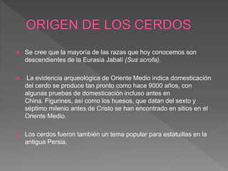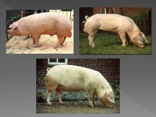 El documento describe diferentes razas de cerdos, incluyendo sus orígenes, características físicas, tasas de crecimiento, tamaño y rendimiento. Se mencionan razas como el Yorkshire, el Duroc, el Landrace Belga y el cerdo criollo mexicano. El documento también proporciona consejos sobre los factores a considerar al seleccionar una raza de cerdos para la producción.