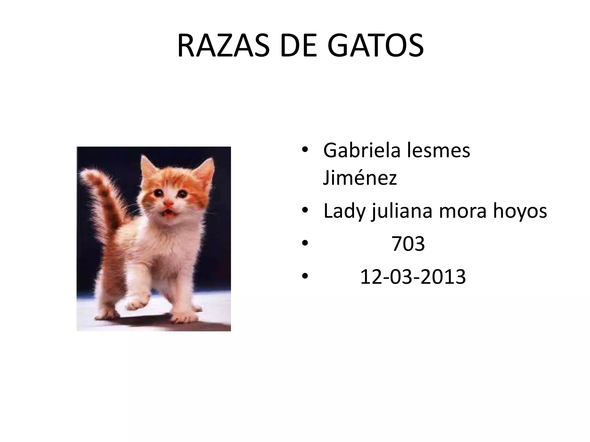 Este documento presenta información sobre varias razas de gatos, incluyendo el Maine Coon, gato Chartreux, Bobtail Japonés, gato común europeo, Sphynx, Balines, Himalayo, y Abisinia. Describe los orígenes, características físicas y historia de cada raza.