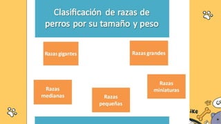Este documento resume las características de varias razas de perros, tanto grandes como medianas y pequeñas. Describe detalles como el tamaño, peso, pelaje, color, temperamento y lugar de origen de razas como el mastín español, san bernardo, bulldog inglés, pastor alemán, beagle, chihuahua y yorkshire terrier. El documento ofrece una visión general de las diferentes razas de perros.