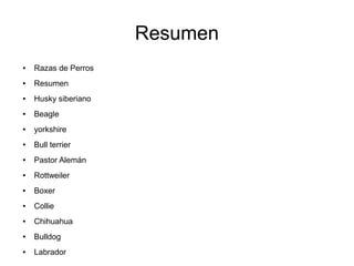 Este documento presenta una variedad de razas de perros, incluyendo el Husky Siberiano, Beagle, Yorkshire, Bull Terrier, Pastor Alemán, Rottweiler, Boxer, Collie, Chihuahua, Bulldog y Labrador. Proporciona detalles sobre el origen, apariencia, temperamento y cuidados de cada raza.