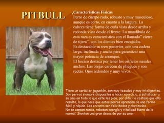 El documento resume las características físicas y de comportamiento de varias razas de perros, incluyendo el Pitbull, Dálmata, Boxer, Pastor Alemán, Caniche, Labrador, Yorkshire Terrier, Bichón Maltés, Bulldog Francés, Siberian Husky. Describe sus orígenes, apariencia, temperamento y usos históricos.