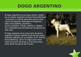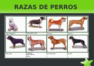 El documento describe brevemente 11 razas de perros, incluyendo su origen, características y propósito. Describe razas como el Dogo Argentino, creado en Argentina para la caza, el Akita Inu originario de Japón usado para la caza y defensa, y el American Pit Bull Terrier originalmente usado en peleas contra toros.