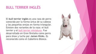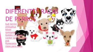 El documento presenta información sobre diferentes razas de perros, incluyendo el bull terrier inglés, chihuahua, bóxer, samoyedo, golden retriever, cocker spaniel inglés, pug y pomerania. Describe brevemente el origen, características y temperamento típico de cada raza. También menciona algunas razas ideales para convivir con niños pequeños como el pug y el bichón maltés.