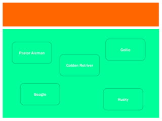 El documento describe varias razas de perros, destacando sus orígenes y características principales. Incluye al pastor alemán, el golden retriever, el beagle, el husky, el collie y el jack russell, cada uno con cualidades específicas que los hacen populares para diferentes roles, como perros de trabajo, compañía o caza. También se menciona su carácter y habilidades que los hacen aptos para tareas específicas y como mascotas.