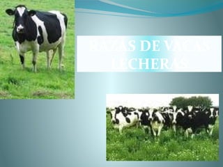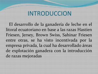 El documento habla sobre las razas de vacas lecheras en el litoral ecuatoriano. Menciona las razas Holstein, Jersey, Brown Swiss y Sahiwal, las cuales han sido introducidas por la empresa privada para desarrollar la ganadería lechera. Explica que la raza Holstein se adapta bien al clima frío y la pradera de pasto kikuyo, mientras que la raza Jersey produce una leche de alta calidad.