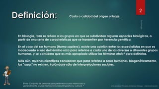 El documento discute el concepto de raza en biología y antropología. Explica que en biología, raza se refiere a grupos en los que se subdividen especies biológicas por características hereditarias. Sin embargo, muchos científicos consideran que no existen "razas" en humanos biogenéticamente, sino interpretaciones sociales. En antropología, razas humanas se refiere a sistemas de clasificación usados entre los siglos XVIII y mediados del XX, aunque no hay consenso sobre su existencia