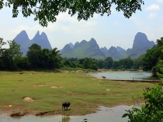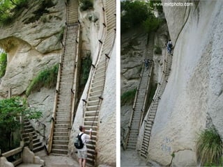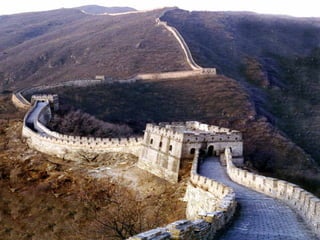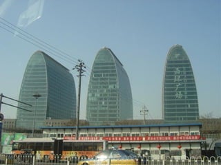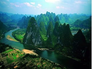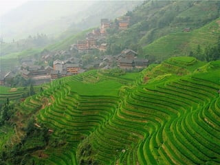 El documento menciona varios lugares y atracciones turísticas en China, incluyendo las terrazas de Baishui y la réplica de la Torre Eiffel en Yangshuo, la Gran Muralla, los grandes edificios y la Torre Pearl en Shanghai, el Centro Comercial del Mundo Jin Mao en Pekín, el Gran Teatro en Hong Kong, y el Puente de Donghai.
