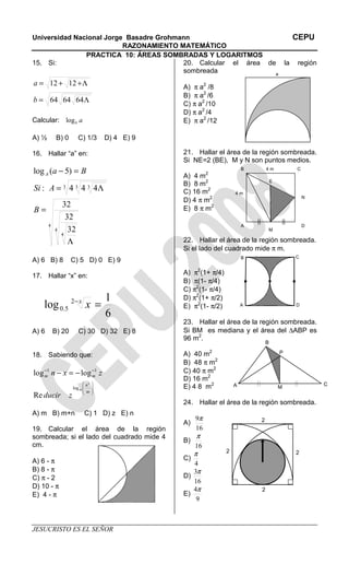 Este documento contiene 31 problemas de áreas sombreadas y logaritmos. Los problemas involucran hallar valores desconocidos, calcular áreas de regiones sombreadas dadas información geométrica como lados de cuadrados, triángulos y figuras regulares, y resolver ecuaciones logarítmicas. El objetivo es practicar el cálculo de áreas complejas y la manipulación de ecuaciones logarítmicas.