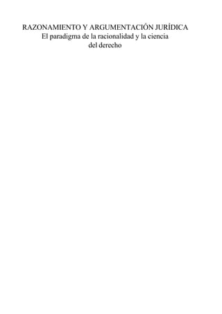 Este documento trata sobre la racionalidad y la argumentación jurídica. Se divide en tres partes principales que exploran el desarrollo del paradigma de la racionalidad desde la antigua Grecia hasta la época moderna, incluyendo el surgimiento de la jurisprudencia como ciencia y su método geométrico de razonamiento. Finalmente, analiza cómo se construyen las inferencias normativas en el derecho a través de la interpretación y el razonamiento jurídico.
