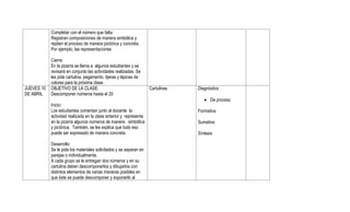 Este documento presenta la planificación de cuatro clases de matemáticas para estudiantes de primer año básico. Los objetivos son componer y descomponer números hasta 20 de forma aditiva usando material concreto, pictórico y simbólico, estimar cantidades, y comunicar procedimientos matemáticos. Las clases trabajan la composición y descomposición de números, amplían el ámbito numérico hasta 30, y abordan la comparación y ordenación de números hasta 30. Cada clase incluye actividades, materiales y tipos de evalu