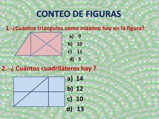 El documento presenta varios ejercicios matemáticos de distribuciones numéricas, conteo de figuras y cuadrados mágicos. En los primeros ejercicios, los estudiantes deben identificar los números que faltan en tablas numéricas para completar las secuencias. Luego, se pide contar triángulos y otros polígonos en figuras geométricas. Finalmente, se presentan cuadrados para que los estudiantes los completen con números sin repetir de forma que la suma de sus filas sea igual.