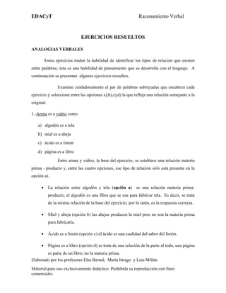 Este documento presenta una introducción al razonamiento verbal como una sub-área evaluada en las pruebas de admisión a la educación superior. Explica que el dominio del lenguaje es fundamental para el éxito académico y que las secciones de analogías verbales, ordenación lógica de párrafos y comprensión lectora miden habilidades como el vocabulario, las relaciones analógicas y la capacidad de análisis. A continuación, ofrece ejemplos resueltos de ejercicios de estas secciones para orientar el est