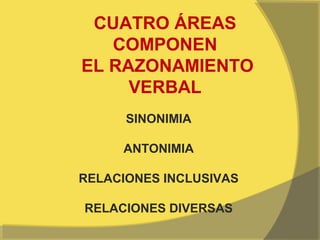 El documento habla sobre el razonamiento verbal y sus cuatro áreas: sinonimia, antonimia, relaciones inclusivas y relaciones diversas. También describe la evolución del estudio del lenguaje desde la oración gramatical a la lingüística del texto. Define texto, sus características y tipos. Explica las reglas de textualidad como cohesión, coherencia e intencionalidad.