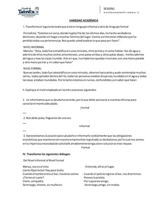 El documento contiene información sobre una sesión de razonamiento verbal y redacción, incluyendo una lista de estudiantes, instrucciones para interpretar situaciones comunicativas, ejercicios sobre niveles de lenguaje formal e informal, funciones del lenguaje, oraciones, y puntuación.