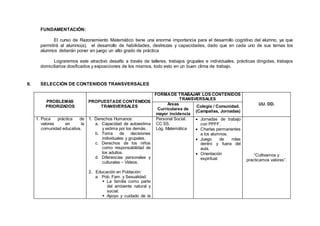 Este documento presenta el programa anual de estudios para el curso de Razonamiento Matemático I-II en el Colegio Privado "San Agustín" durante el año 2005. Incluye información sobre el directorio del colegio, el cronograma de actividades y contenidos por trimestre, así como la selección de contenidos transversales y problemas priorizados a abordar durante el año.