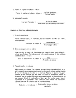 Este documento describe diferentes razones financieras que pueden usarse para analizar la situación financiera de una empresa. Las razones se dividen en cuatro categorías: liquidez, actividad, apalancamiento y rentabilidad. Cada categoría incluye varias razones específicas como la razón de circulante, rotación de inventarios, razón de deuda total y margen de utilidad. Las razones financieras proporcionan una evaluación general de los puntos fuertes y débiles de una empresa, pero no son predictivas y deben analizarse en el contexto de tend